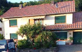The rolladens on this house are green. Many homes have automatic rolladens, but some (like ours) have to be raised/lowered using a pull rope.